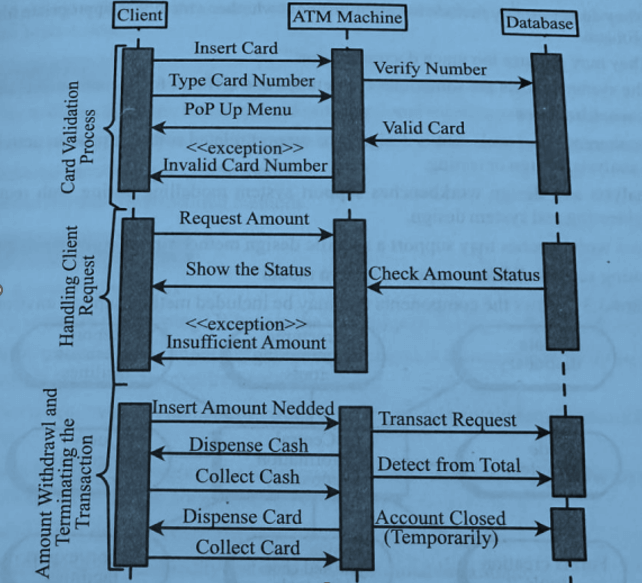 - Objects are shown on the top of the diagram, such as Client, ATM, and Database.